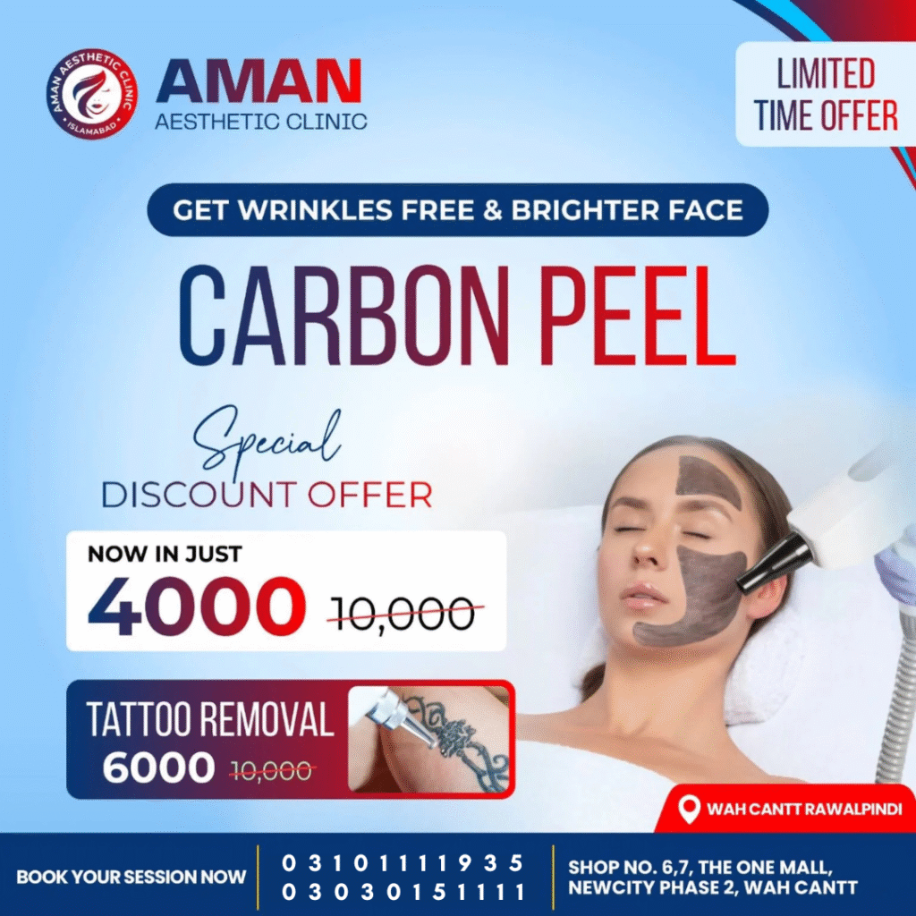 Transform your skin and boost your confidence with our limited-time Carbon Peel and Tattoo Removal offers at Aman Aesthetic Clinic. For more details, expert guidance, or to schedule your session, contact us at 0303 0151111, where our dedicated staff will ensure a smooth and hassle-free booking process. You can also visit our advanced facility at Shop No. 6 & 7, The One Mall, NewCity Phase 2, Wah Cantt, Rawalpindi, where we combine cutting-edge technology with professional expertise to deliver visible results. Our Carbon Peel treatment, now just Rs. 4,000 instead of Rs. 10,000, works wonders in reducing wrinkles, evening out skin tone, and brightening your complexion. For those looking to remove unwanted tattoos, our safe and effective Tattoo Removal service is available at Rs. 6,000 instead of Rs. 10,000. Each procedure is performed by trained specialists who prioritize comfort, safety, and optimal results.