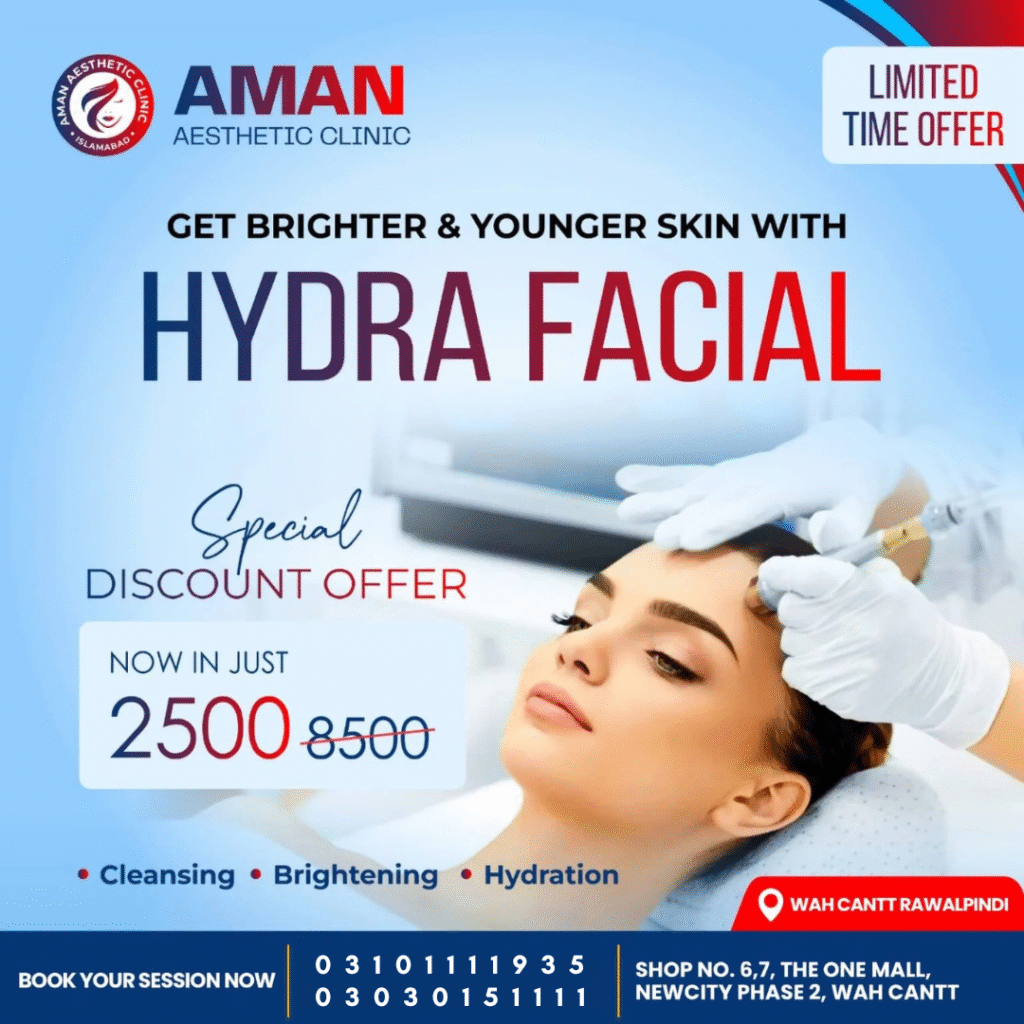 Take advantage of our limited-time Hydra Facial offer at Aman Aesthetic Clinic and give your skin the care it deserves. For bookings, inquiries, or personalized skin advice, call us today at 0303 0151111 and our friendly staff will be happy to assist you. You can also visit us at Shop No. 6 & 7, The One Mall, NewCity Phase 2, Wah Cantt, Rawalpindi, where our modern facility and expert team are ready to provide a relaxing and results-driven experience. Priced at just Rs. 2,500 instead of Rs. 8,500, this treatment offers deep cleansing, brightening, and intense hydration to leave your skin glowing and refreshed. Don’t wait—book your session now and step into a fresher, younger look. Our advanced Hydra Facial technology is designed to work on all skin types, ensuring safe and effective results every time. Each session is customized to your unique needs, targeting dullness, dryness, and uneven texture for visibly healthier skin.